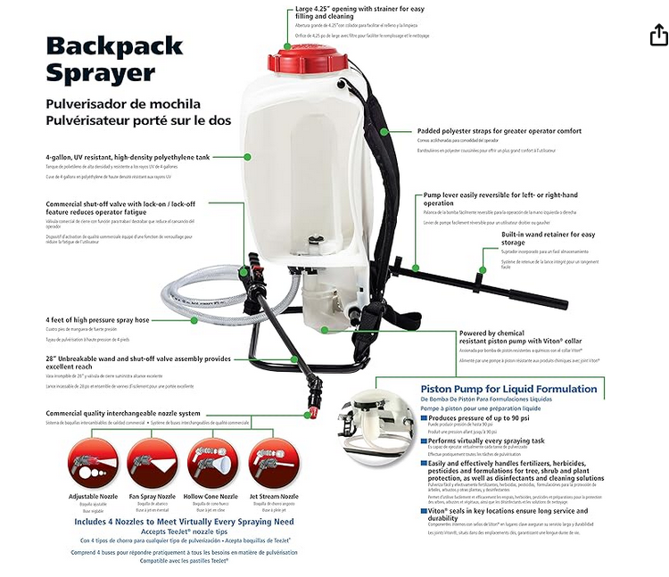 Easily spray liquid disinfectants, fertilizers, herbicides, pesticides with Solo's high-performance piston pump for tree, shrub and plant protection Four easily changeable commercial-grade spraying nozzles-Plastic Adjustable, Fan Spray, Hollow Cone, Jet Stream nozzle and is TeeJet compatible Designed with a commercial shut-off valve that securely locks in either the on or off position to minimize user fatigue, the pump handle is interchangeable for left or right-hand operation